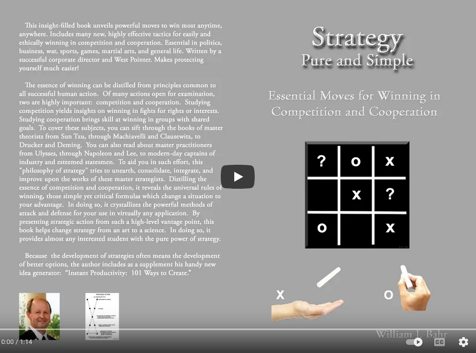 Want to win? This insight-filled handbook unveils powerful moves to win most anytime, anywhere. Includes highly effective tactics for ethically winning in competition and cooperation, whether in politics, business, war, sports, games, martial arts, or general life. Not a fall-off-the-log easy read, but a theoretical work that clears the deck of anecdotes to reveal the potent basics. Best used as a ready-reference to prompt general solutions when confronting specific problems. “Look inside” before ordering. Written by a noted innovation developer and corporate director.