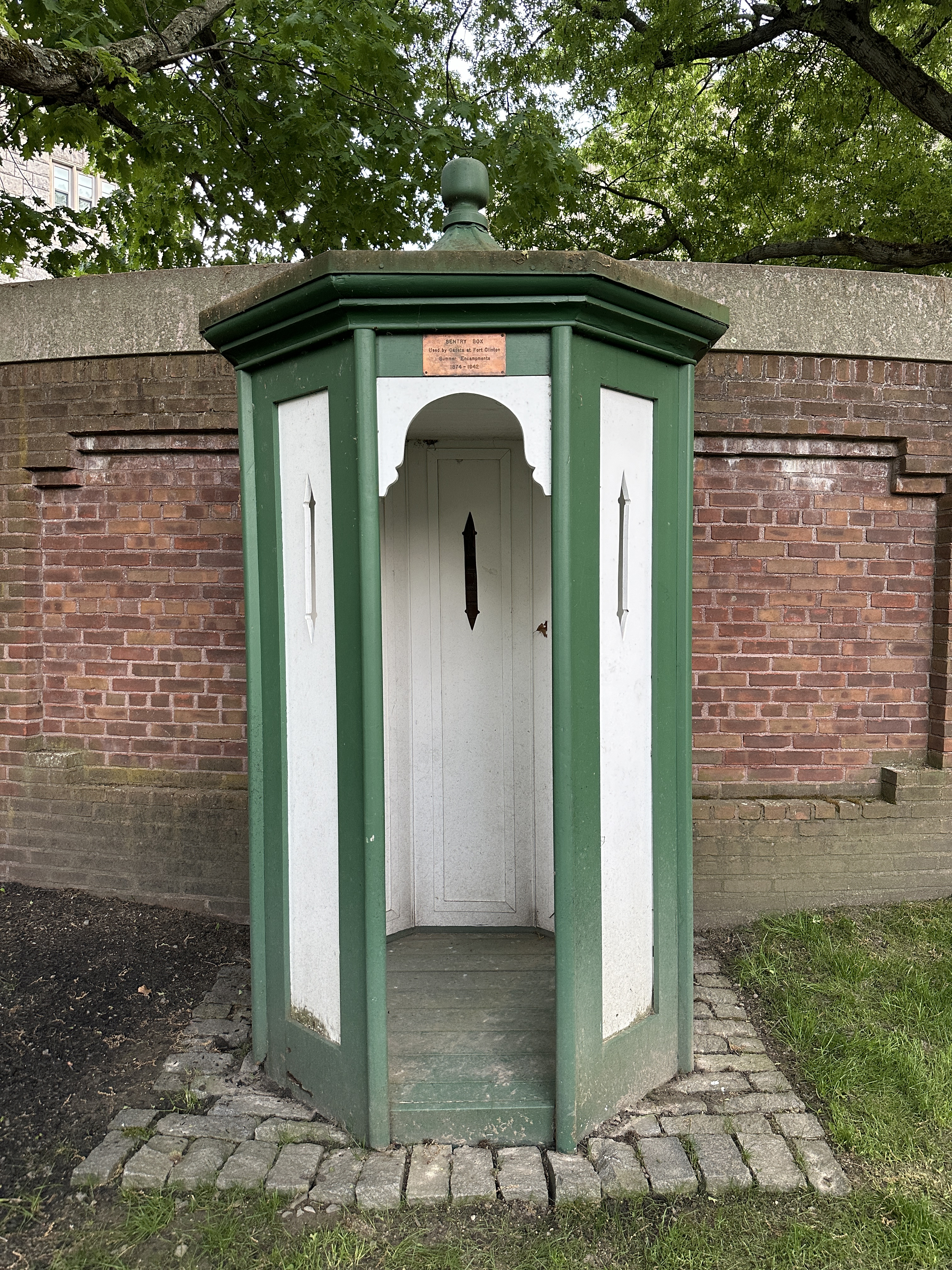 Sign on sentry box says: "Senty Box — Used by Cadets at Fort Clinton