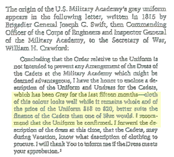 "Cadet Uniforms" courtesy USMA AOG 2000, West Point 2001 Bicentennial Calendar: "Four years later [1814], the familiar gray full dress coat appeared -- because blue woolen cloth was too expensive."